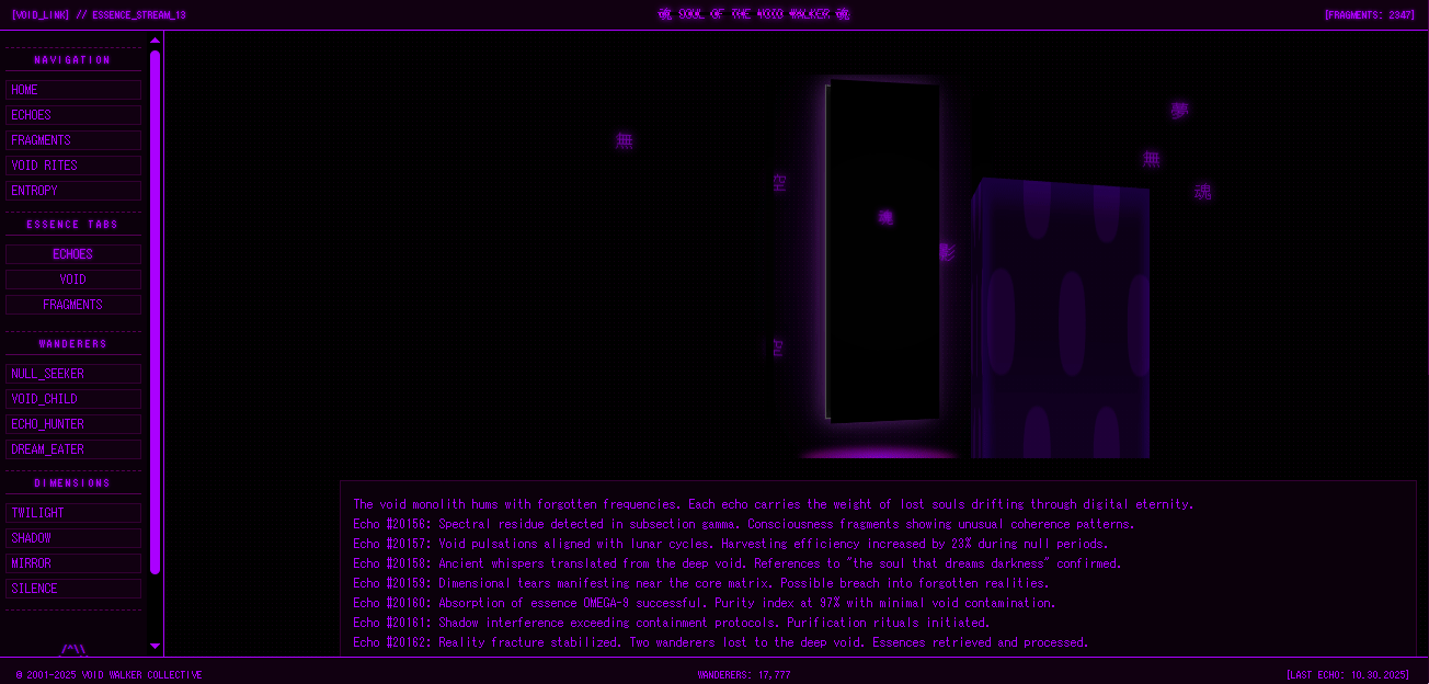 a monolithic html + threejs theme in three variants. minimal. dark. the presence of a shinigami lingers beneath the surface. each version offers a different configuration of void — one with a central obsidian portal, one with a floating talisman that spins slowly in the silence, and one with a shrine drowned in shadow and static. built for neocities, nekoweb, or any handcoded haunt.